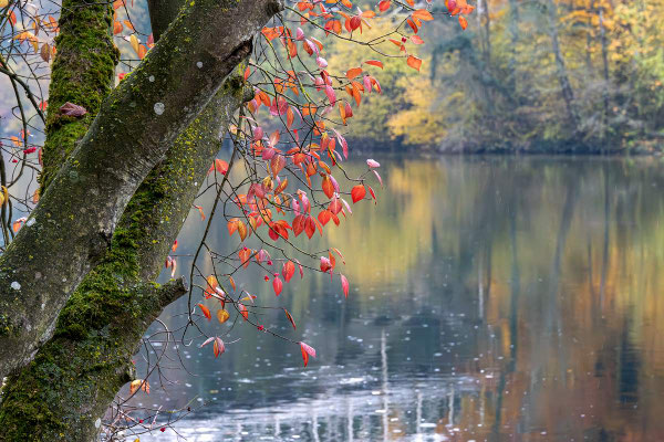 Es war um die Mittagszeit und der Morgennebel hatte sich bereits etwas gehoben. Allerdings war es noch bitterkalt. Auch Sonnenstrahlen konnten die Nebelsuppe noch nicht durchdringen. Angestrengt scannte ich die Wasseroberfläche, konnte aber kein antreibendes Insekt zwischen den Herbstblättern erspähen. Es gelang mir nur, eine kleine Mücke zu erhaschen, umgerechnet etwa in Hakengröße #30. Ansonsten war es auf und über dem Wasser absolut ruhig.