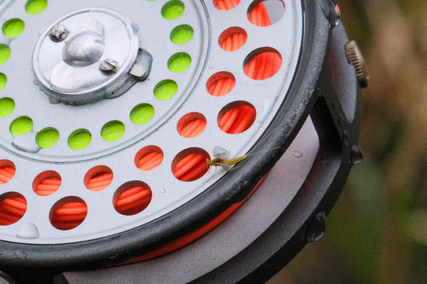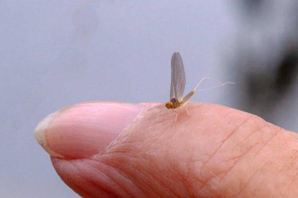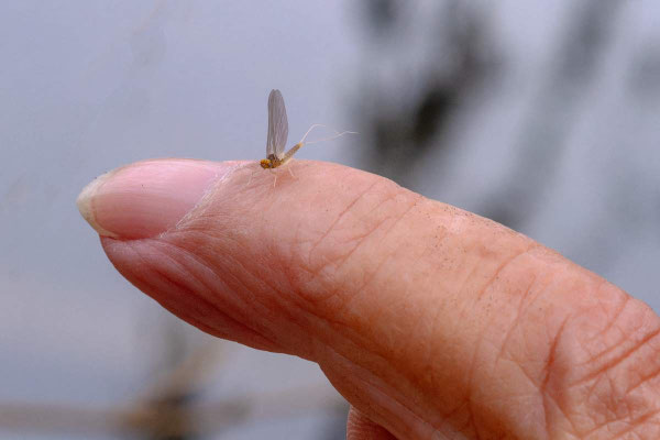 Nachdem ich einige der Mini-Eintagsfliegen einsammeln konnte, stellte ich fest, es waren eindeutig Vertreter der Baetis-Familie (Baetis fuscatus oder auch Bi-oculatus genannt). Sie schlüpften hier in zig-tausendfacher Ausführung an der Wasseroberfläche. Die Emergenz dieser Pale Watery Duns beginnt um die Mittagszeit mit langer Drift, knapp unter der Wasseroberfläche. Wobei zwar die Fische stiegen, aber noch keine Sub-Imagos auf der Wasseroberfläche zu sehen waren. Trübes Wetter und sogar leichter Nieselregen sind oft Auslöser für diesen Massenschlupf.